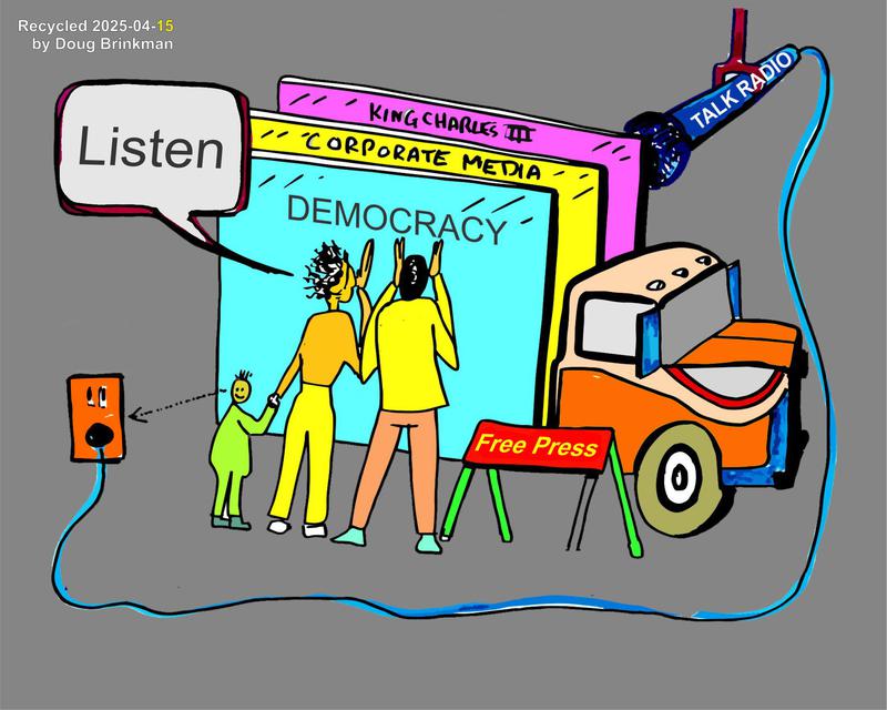 The orange Free Press truck tries to help but ends up blocking the view—trying to explain the meaning of life while standing in front of the projector. Meanwhile, the crane‑mounted Talk Radio mic dives in with talk radio energy, bypassing the polite layers and plugging straight into the “Listen” outlet. It’s a reminder that unfiltered voices still find ways to cut through the static.