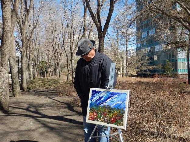 The Legislature Has No Dome, Unity began on an easel in a light drizzle of rain from the heavens on 15 April 2019, behind Herman Poulin’s Service Through Christ statue — right stage of the Alberta Legislature front steps, below the Lieutenant Governor’s flag and beside the reflection pool — on the same day the world watched the Notre‑Dame Cathedral burn. Dozens of passersby, young and old, on the Alberta Legislature grounds were invited to add a renewal of flowers along the base of the painting, turning the work into a small act of shared civic ritual. I completed it in 2021, during COVID‑19, carrying the story of renewal forward. The Grande Stage Democracy was painted on the backside.