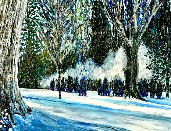 As has been tradition since 2020, paint was added to Skaters on Ice on each new years day beside the ice rink on the back lawns of the Alberta Legislature. 2026, an eagle in flight was added backside, a small gesture of lift in a heavy season. The tanks and guns were painted by the rink side behind the treeline on Remembrance day 2025, while the cannons fired.Â
