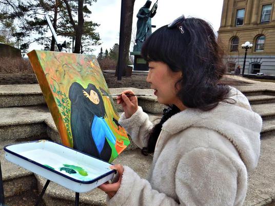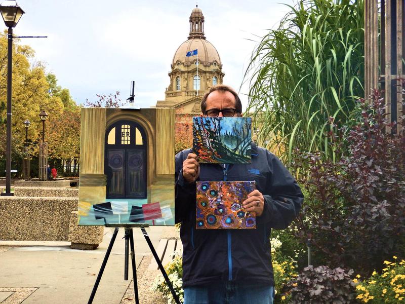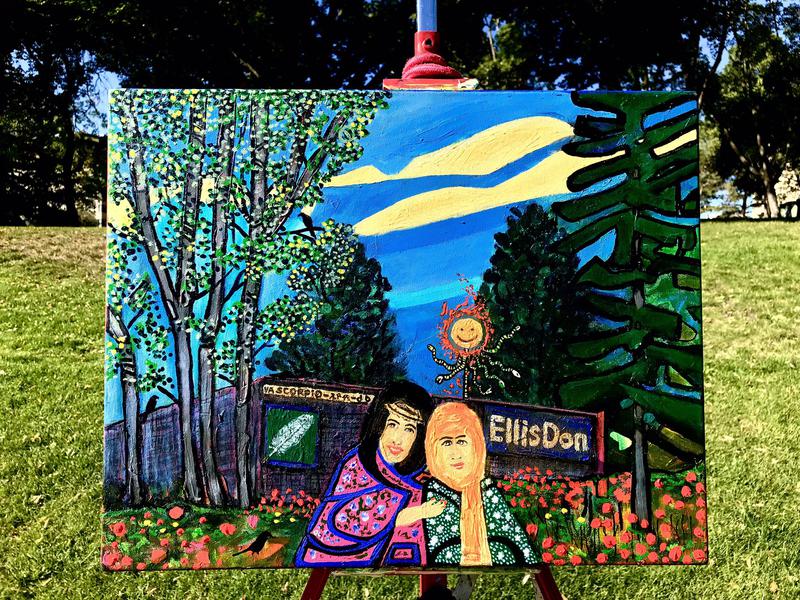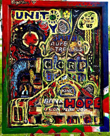 🍁US/ Them, Art Show & Tell, of a Point of Order, add a little ice cream, my just reward. A young woman, lingering with a tattooed crowd in downtown Edmonton near the library, complimented my artwork. After finishing my rapidly melting ice cream in the 24°C heat, I walked over to her gang to show the backside, titled Disorder. Suddenly, a young man lunged at me. "Get the f*** away from here!" he snapped. Before I could react, the group's matriarch—Mama Tattoo—spoke up. "I like your painting," she said, her voice steady. The young man’s demeanor shifted. He looked at the artwork again, his expression softening. "That's an amazing piece of art," he admitted.