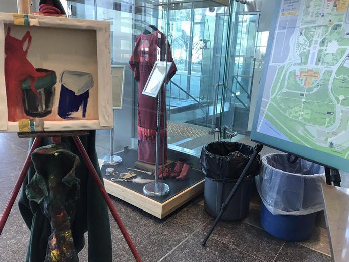 A collision of warning signals and domestic ritual, this work continues the Eye on Red series—an ongoing response to global conflict and local Indigenous realities. Daniel’s street‑corner beat threads the perimeter, his cadence tapping like a rail‑line pulse: word‑up, wake‑up, world‑on‑edge.